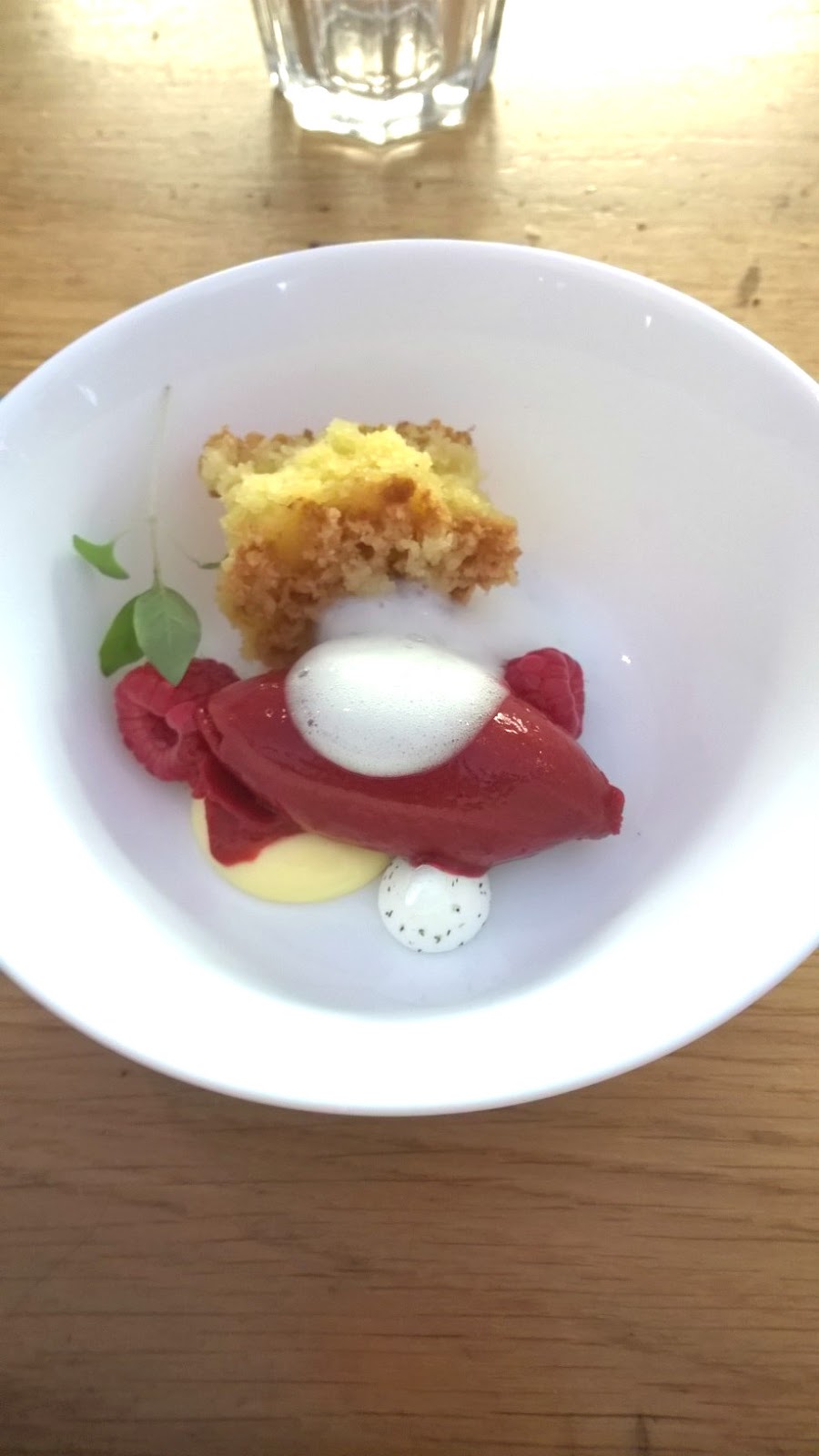 Le dessert, fin et léger s’accompagne d’un sorbet de framboises anisé (la touche anisé, il fallait la deviner !), avec une émulsion de yuzu, une crème au citron et la petite meringue. Le pain de gênes apporte une touche de consistant et de doux en bouche (vive l’amande). Cela permet de terminer sur une touche sucrée sans être alourdi.