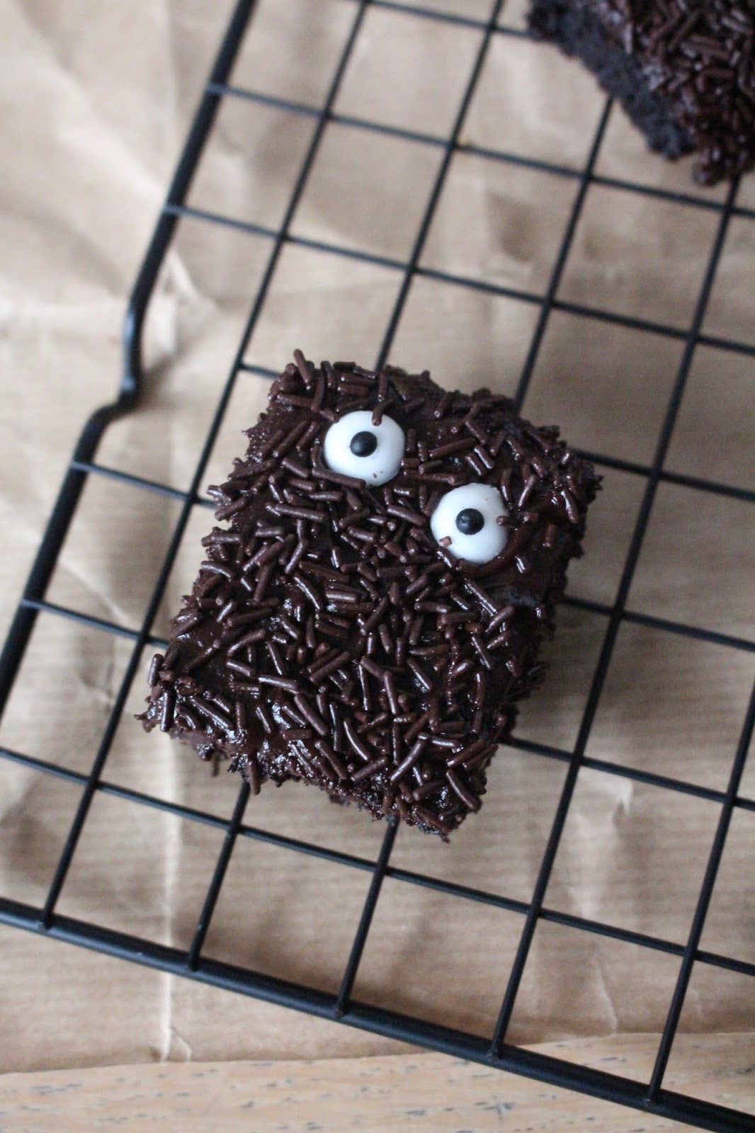 Coupez les brownies en carré, nappez le dessus de chocolat liquide avec un pinceau puis ajoutez les yeux et saupoudrez de vermicelles au chocolat.