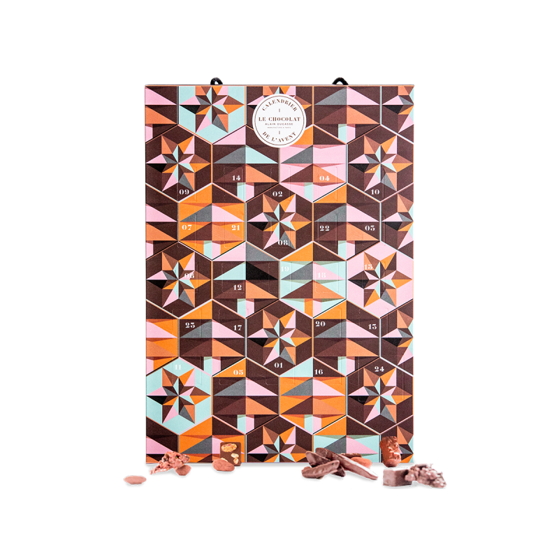 Le calendrier de l’Avent d’Alain Ducasse , 24 chocolats : du noir, du praliné mais aussi des orangettes, des rochers. Que du bon