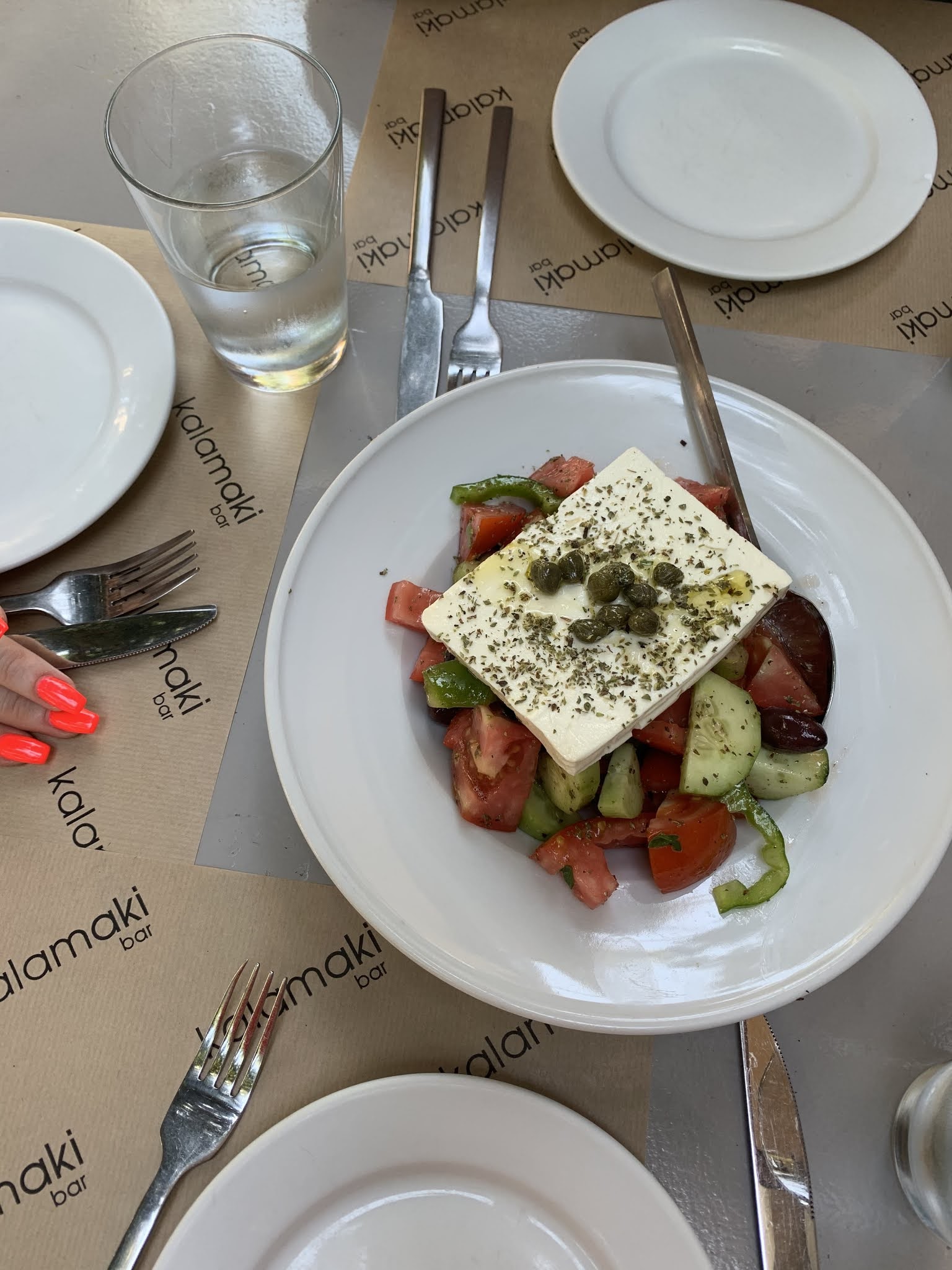 Koriatiki aka salade grec, tomates, concombres, oignons, fêta et olives chez Kalamaki Bar