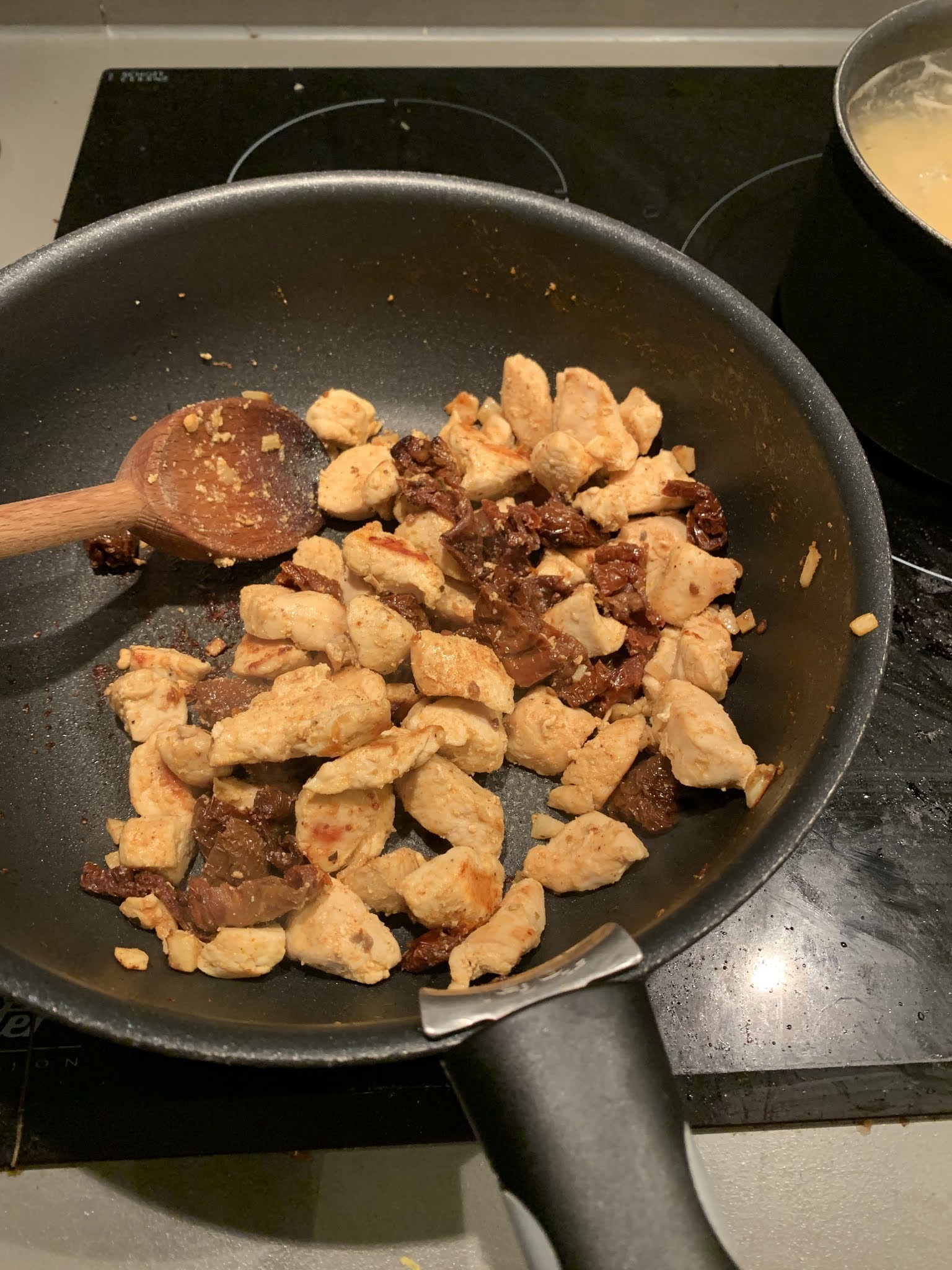 Pendant ce temps on coupe le poulet en petits morceaux , on enlève les tomates confites qu’on met dans une assiette sur le côté et on fait revenir le poulet avec les morceaux d’ail. On ajoute du paprika et du sel et on fait dorer le poulet, si nécessaire ajoutez un peu d’huile d’olive