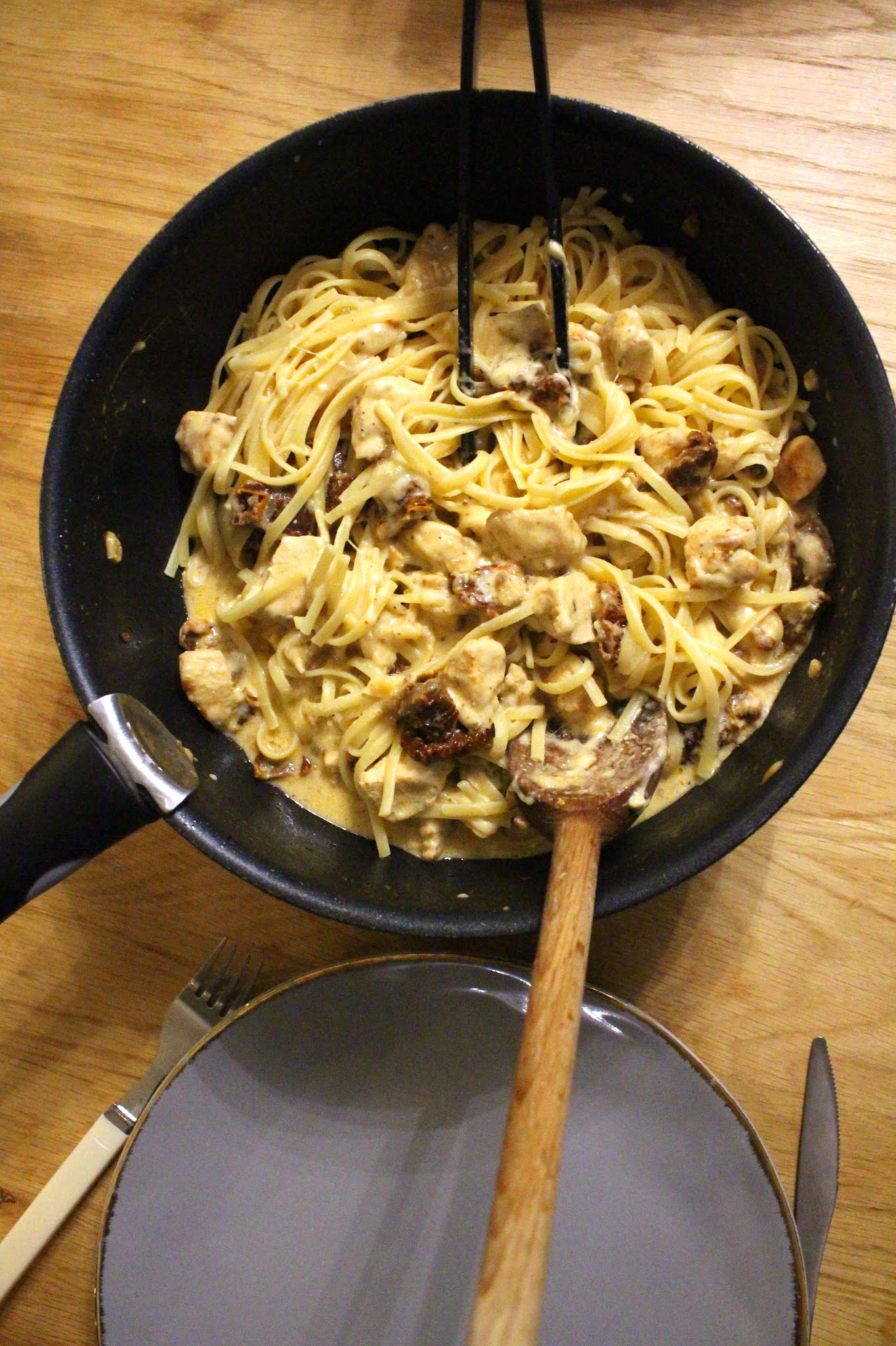 Une fois que le poulet est cuit et doré, vous ajoutez les tomates confites, le lait, la crème et la mozzarella râpée, mélangez doucement et dès la première ébullition baissez le feu.